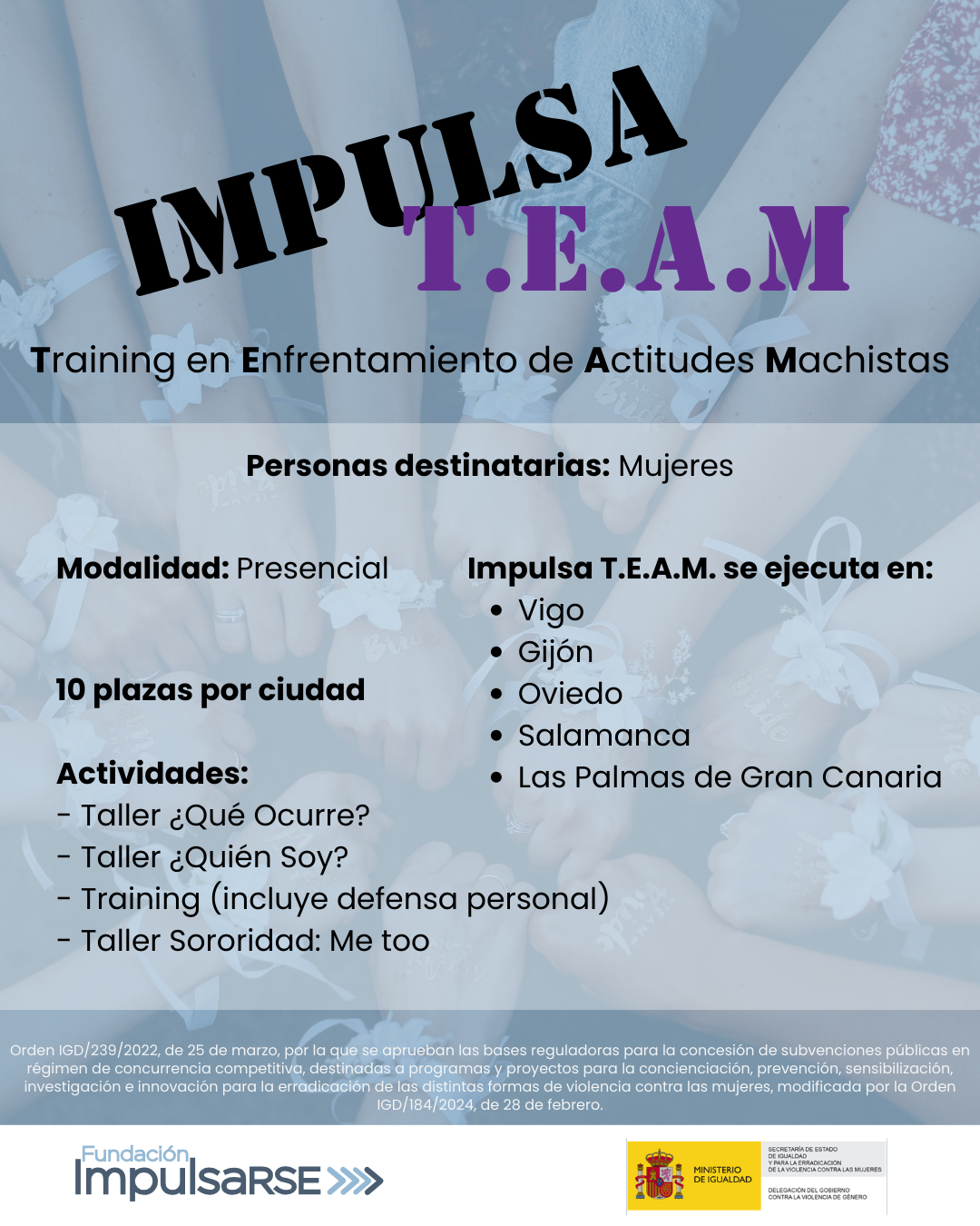 Impulsa T.E.A.M. es un programa de prevención y sensibilización frente a la violencia de género dirigido a mujeres, diseñado para fortalecer su autonomía personal, emocional y social antes de que se produzcan situaciones de abuso.