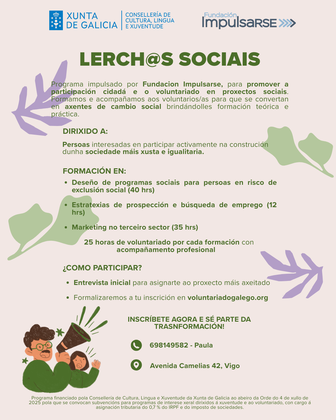 Programa financiado pola Consellería de Cultura, Lingua e Xuventude da Xunta de Galicia ao abeiro da Orde do 4 de xullo de 2025 pola que se convocan subvencións para programas de interese xeral dirixidos á xuventude e ao voluntariado, con cargo á asignación tributaria do 0,7 % do IRPF e do imposto de sociedades.