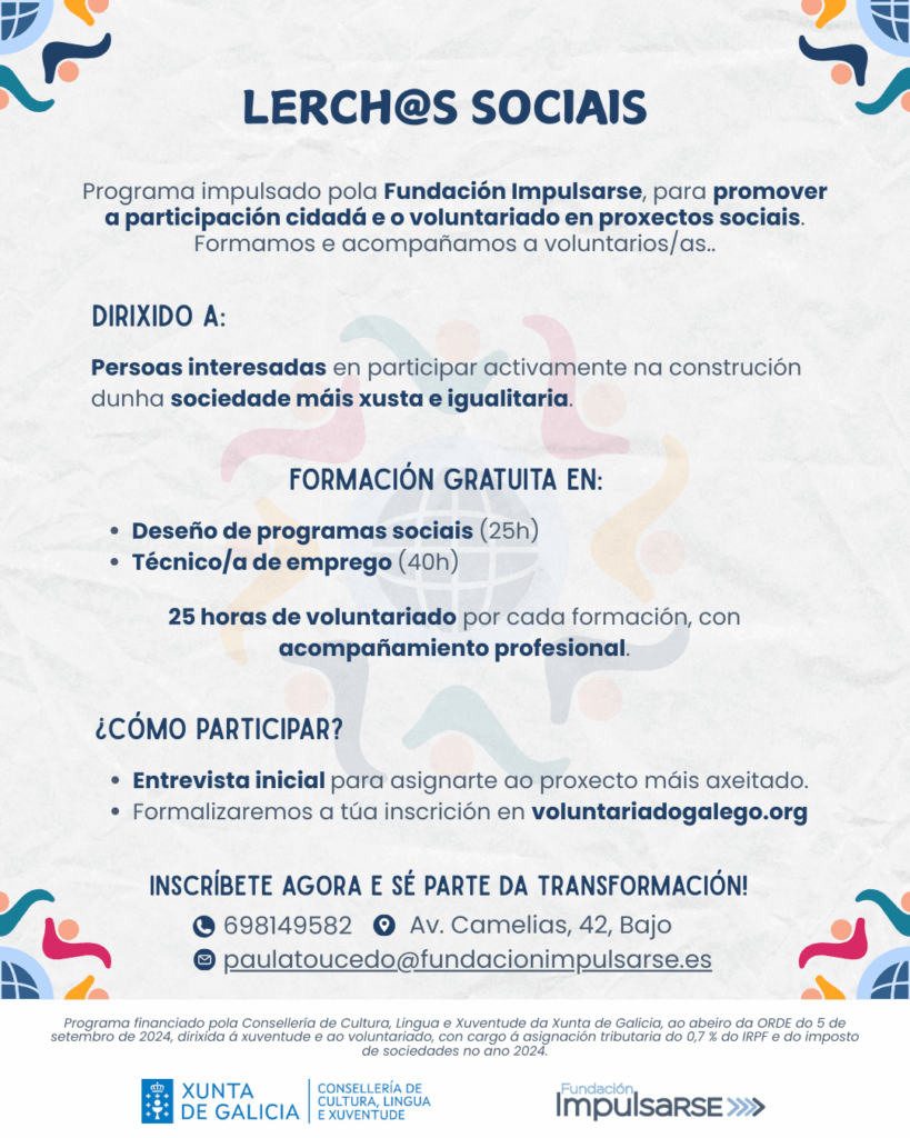 Lerch@s Sociais é un programa impulsado pola Fundación Impulsarse para promover o voluntariado activo e a participación cidadá en proxectos sociais. O obxectivo? Formar persoas comprometidas e convertelas en verdadeiros axentes de cambio social.