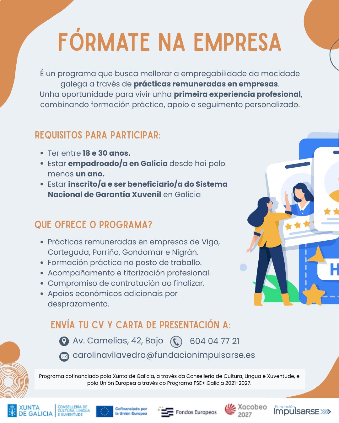 A Fundación Impulsarse para o Desenvolvemento do Emprego e a Integración Social participa no Programa Fórmate na empresa 2026, impulsado pola Xunta de Galicia e co apoio financeiro da Unión Europea, como entidade beneficiaria dunha subvención destinada a fomentar a empregabilidade da mocidade galega.