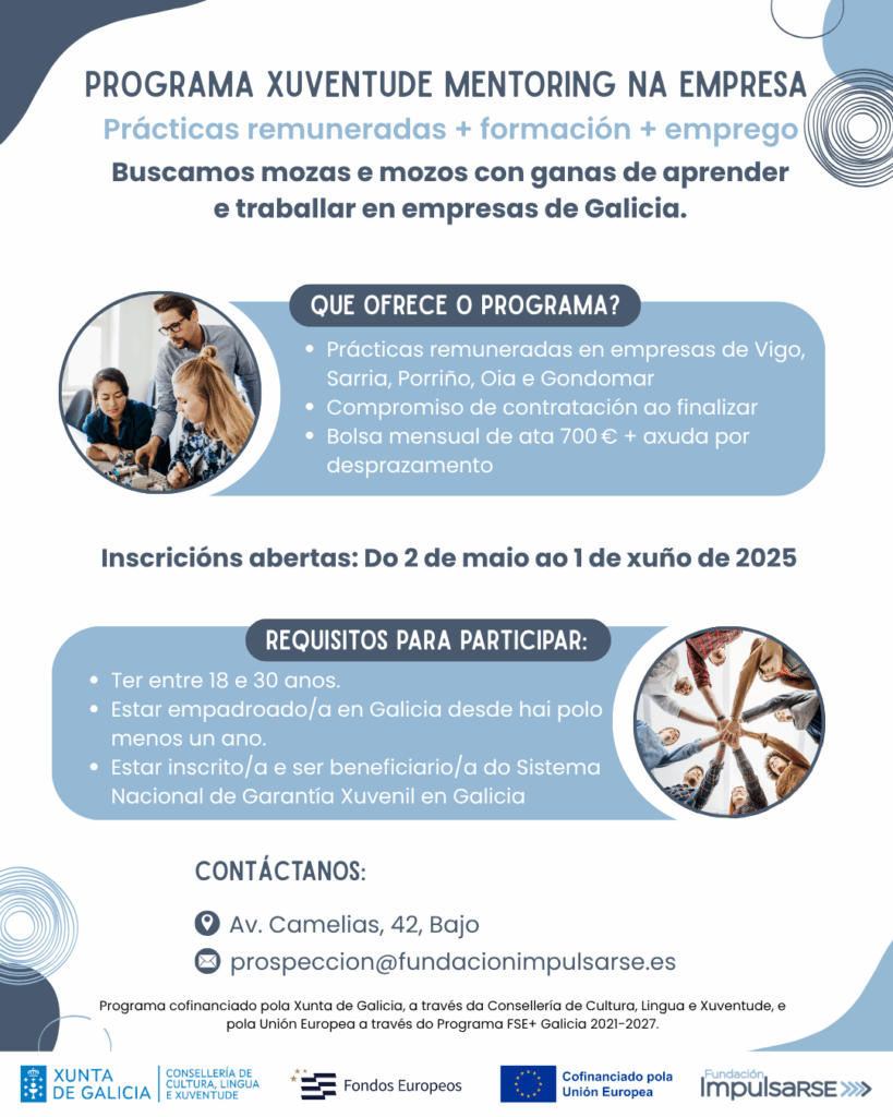 Fundación Impulsarse para o Desenvolvemento do Emprego e a Integración Social participa no Programa Xuventude Mentoring na Empresa, impulsado pola Xunta de Galicia e co apoio financeiro da Unión Europea, como entidade beneficiaria dunha subvención destinada a fomentar a empregabilidade da mocidade galega.